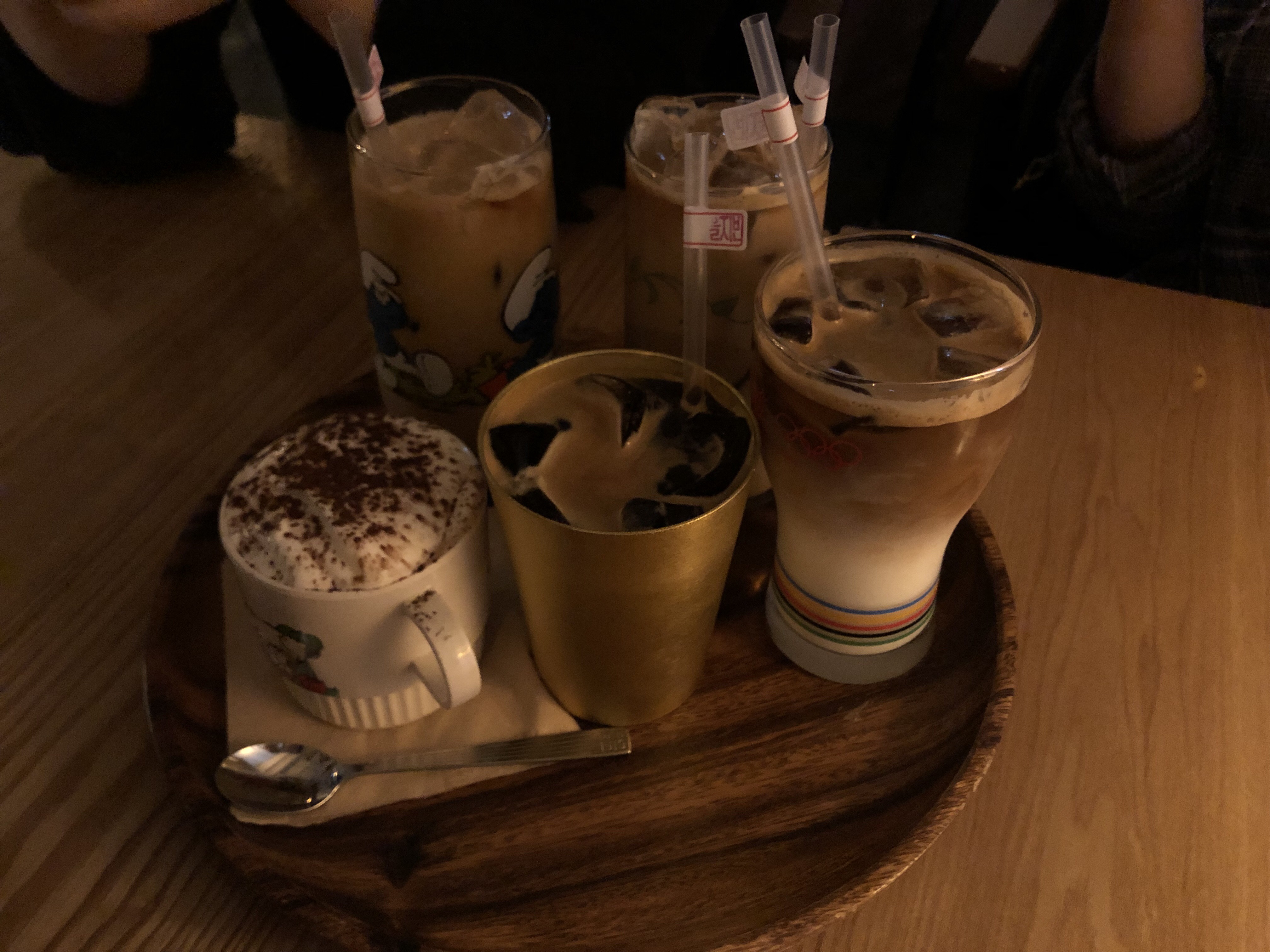 여러 명의 친구들과 함께 갔던 곳이라 음료는 여러 종류를 주문하게 되었어요. 아이스바닐라라떼(5,500원), 아이스아메리카노(4,500원), 아이스라떼(5,000원), 아인슈패너(6,000원)에 치즈케이크 한 조각까지 함께요.