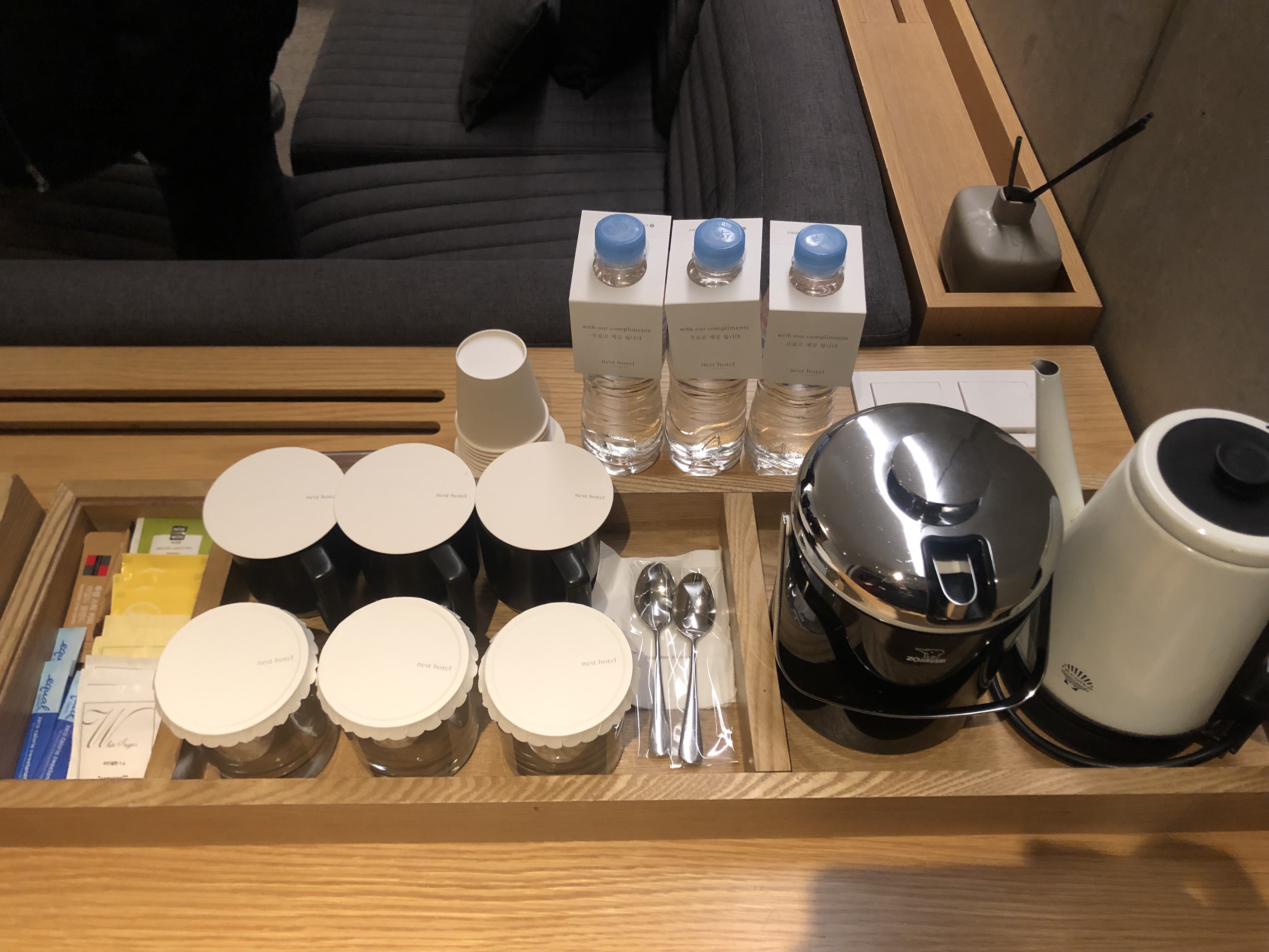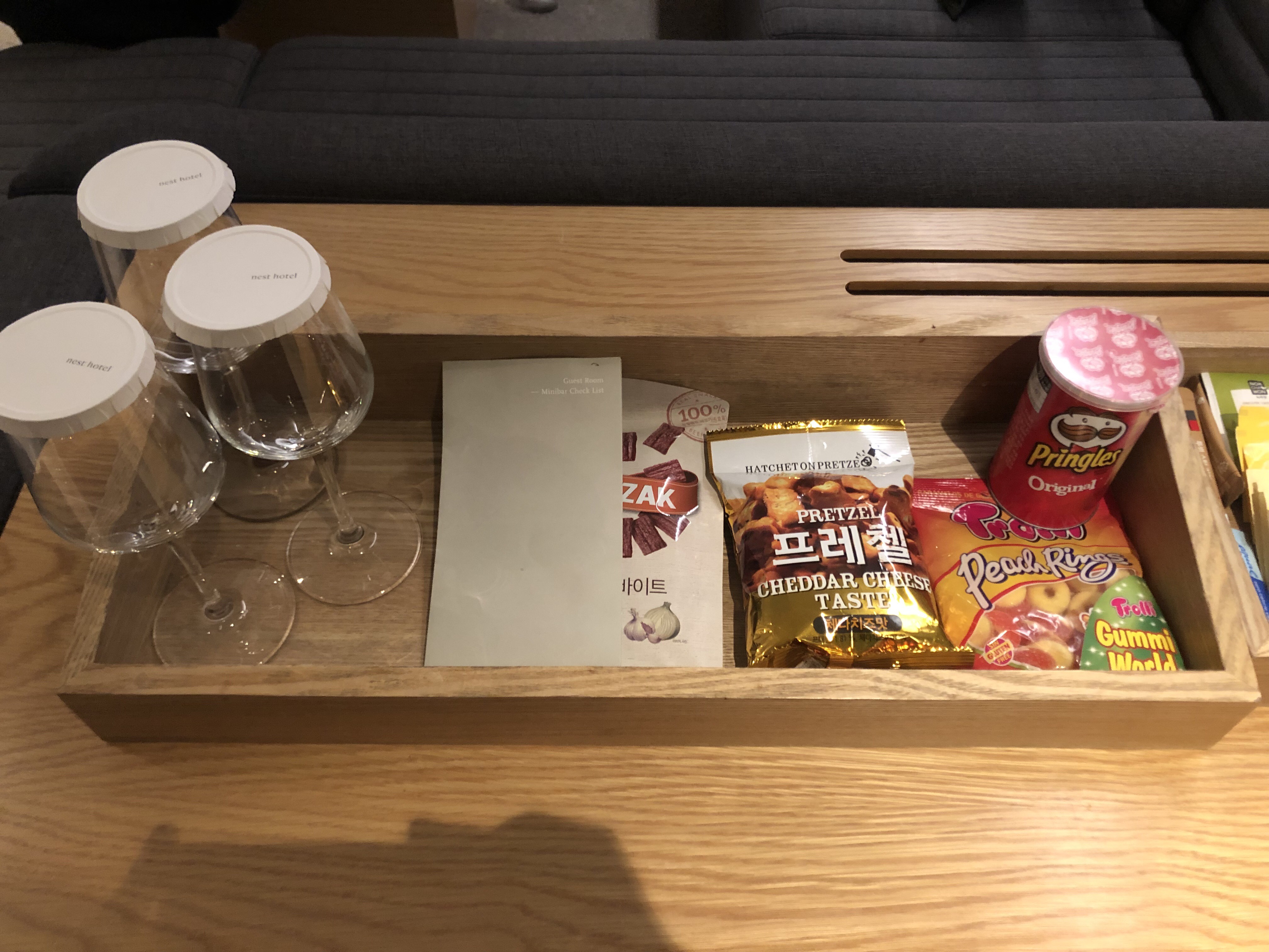 방에서 기본으로 먹을 수 있는 것은 웰컴초콜릿과 생수(인당 1개씩), 티백이 있었고 그 외에 놓여져있는 과자는 먹으면 돈을 지불해야했어요.