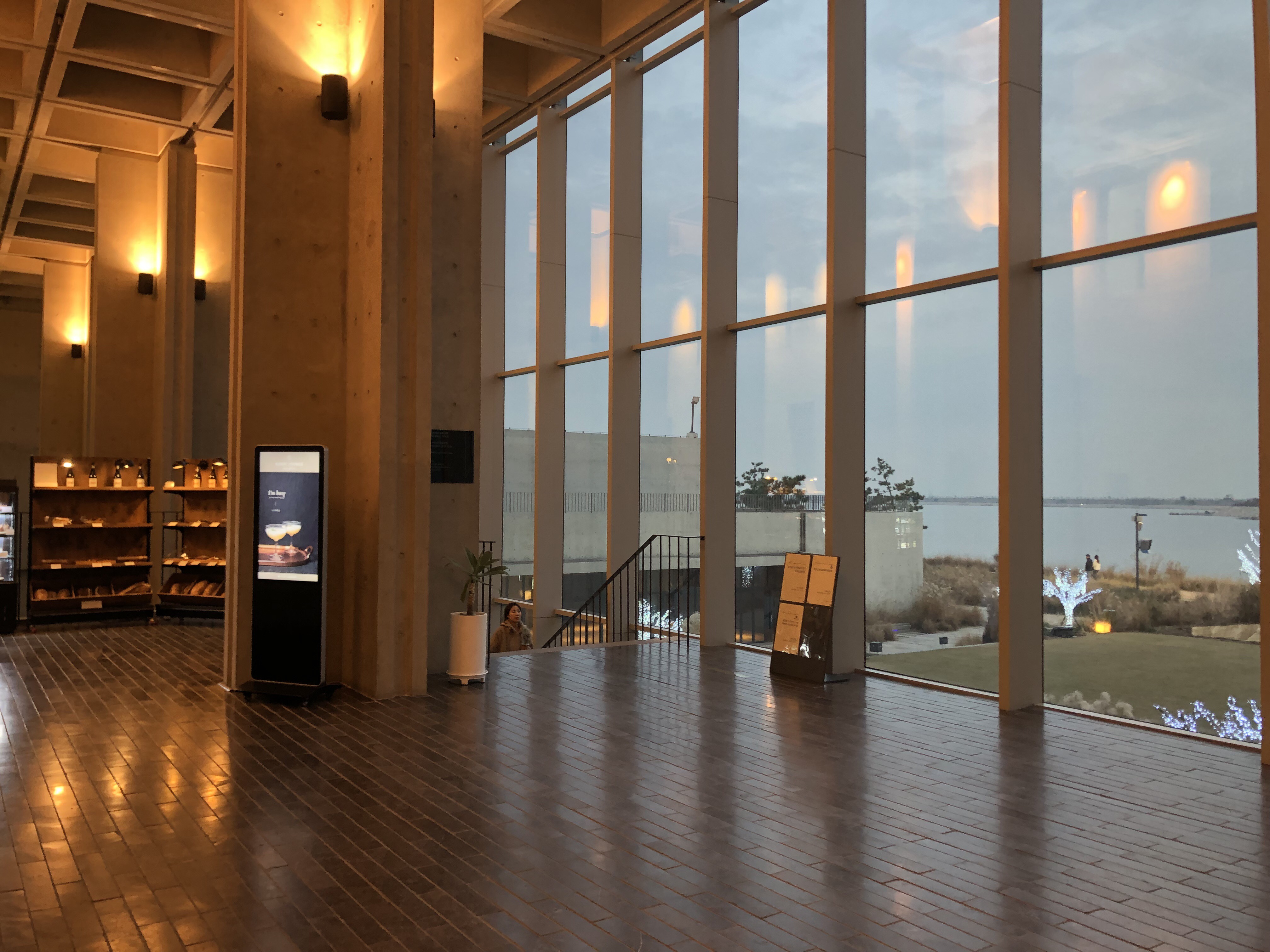 내부가 건물 외부만큼 딱 떨어지고 깔끔한 느낌이에요. 넓은 창에 바다를 한 눈에 볼 수 있도록 해놓기도 했고요. 바깥에 보니 바다 주변으로 호텔 산책로가 조성이 되어있는 것 같았는데, 도착한 날에는 어두워져서 내일 가자 싶어서 가지 않았더니 다음 날에 비가 와서 둘러보지를 못했어요.