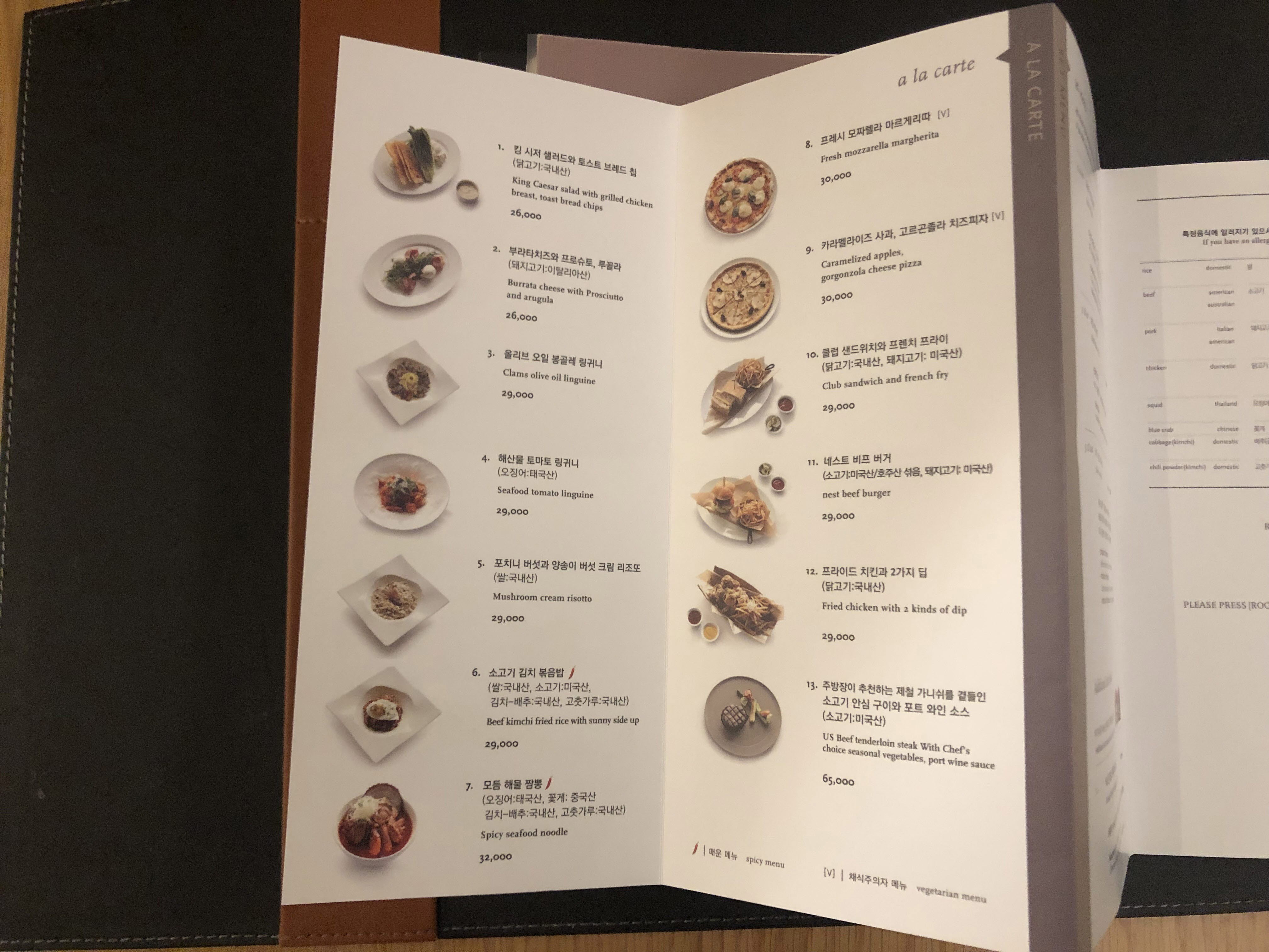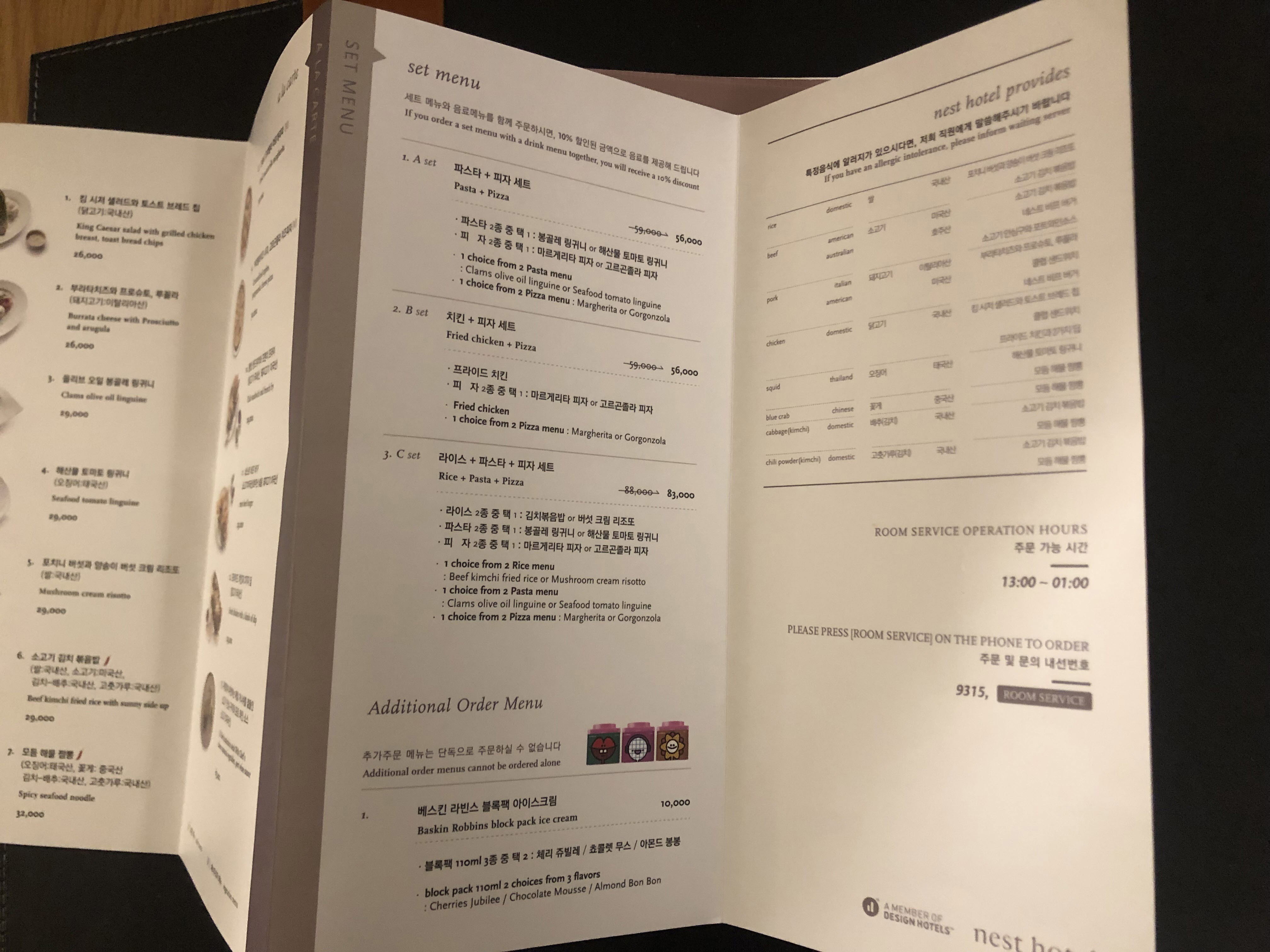 룸서비스로 온 프레시 모짜렐라 마르게리따(30,000원)와 카라멜라이즈 사과 고르곤졸라 치즈피자(30,000원)는 맛있었어요. 보통 파스타집에서 파는 맛과 크게 다르지는 않았지만 더욱 뜨끈하게 편안한 방안에서 먹을 수 있다는 점이 너무 좋았어요. 특히, 고르곤졸라 피자 위에 얹어져있는 토핑들이 특이했어요. 건사과에 호두가 있었는데 이런 조합으로는 처음 먹어보는 것 같아요. 건사과는 바삭하게 맛있었고 호두는 엄청 고소했어요. 너무 배부르게 잘 먹고 텔레비전을 보면서 쉬다가 주말 하루를 편안하게 잘 마무리 하였답니다.