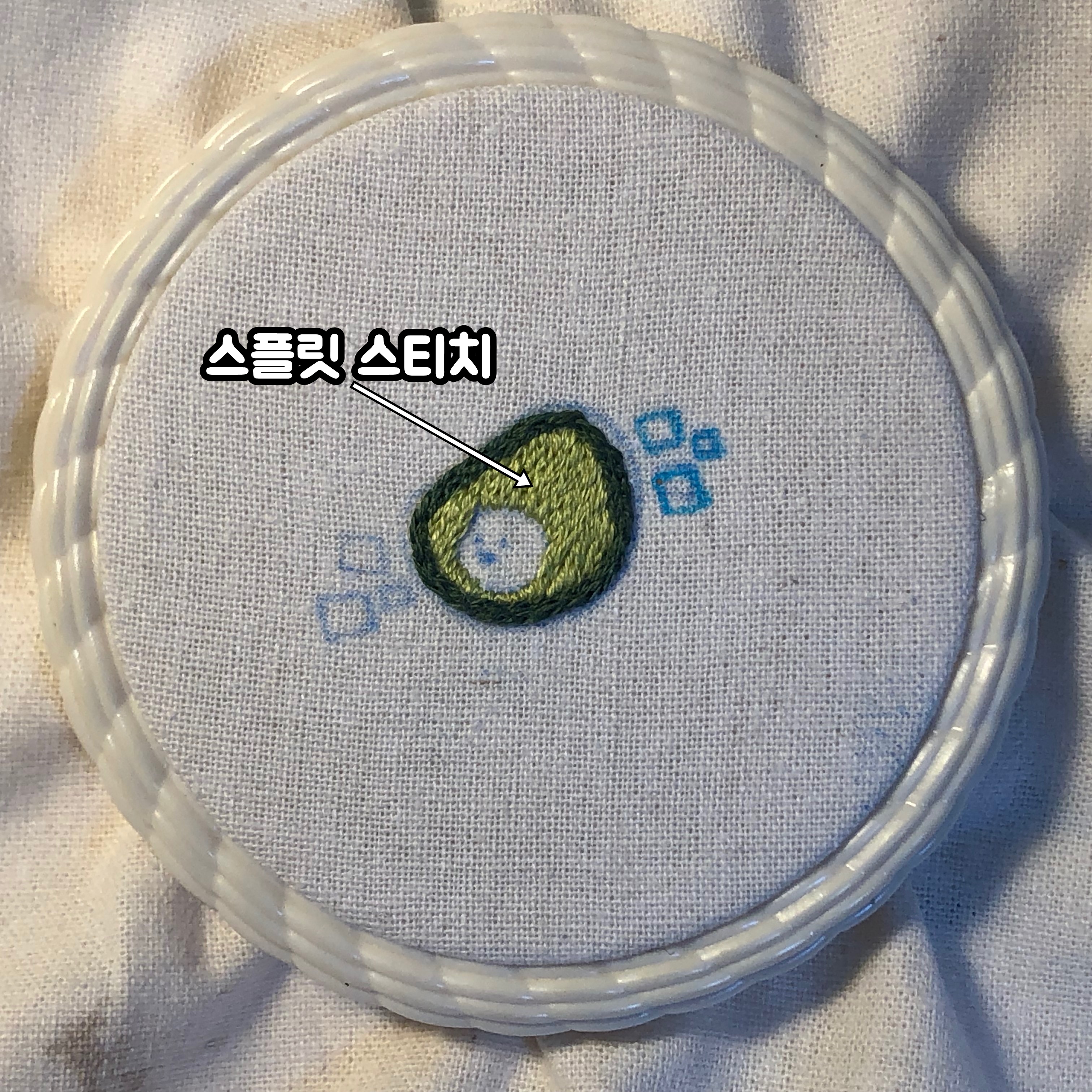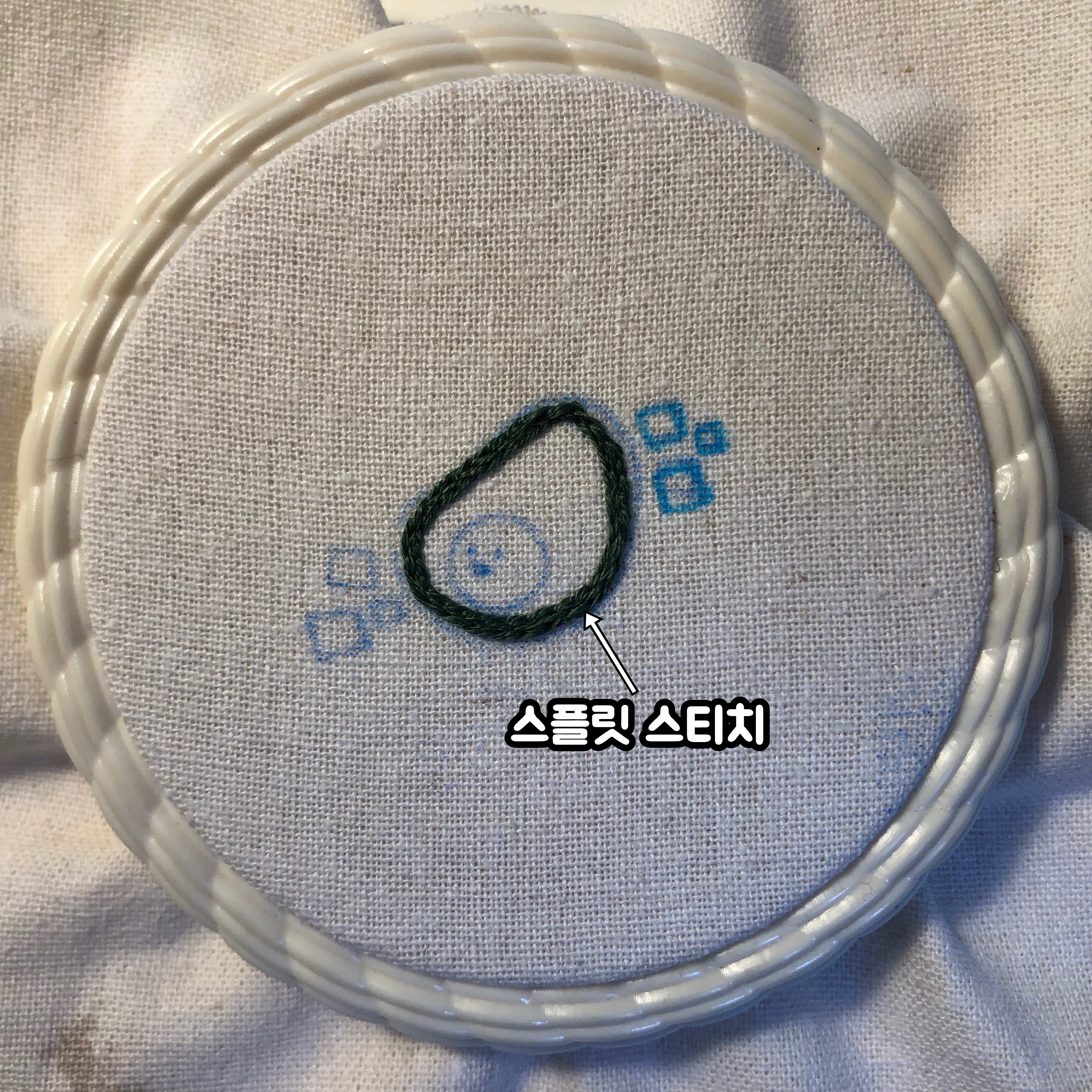 이제 본격적으로 바늘과 실로 자수를 놓는 작업이에요. 6번 바늘에 520번 실을 끼워 아보카도의 껍질 부분을 스플릿 스티치로 수 놓습니다. 스플릿스티치는 프랑스 자수에서 가장 많이 사용하는 기법인데요. 예전에 공방에서 배울 때는 동물 일러스트 도안으로 작업을 많이 했었는데 동물의 털을 자연스럽게 표현 하기 좋은 기법이라고 배웠습니다. 저는 스플릿 스티치로 아보카도 외곽선을 따라 둥글게 바느질하였어요.