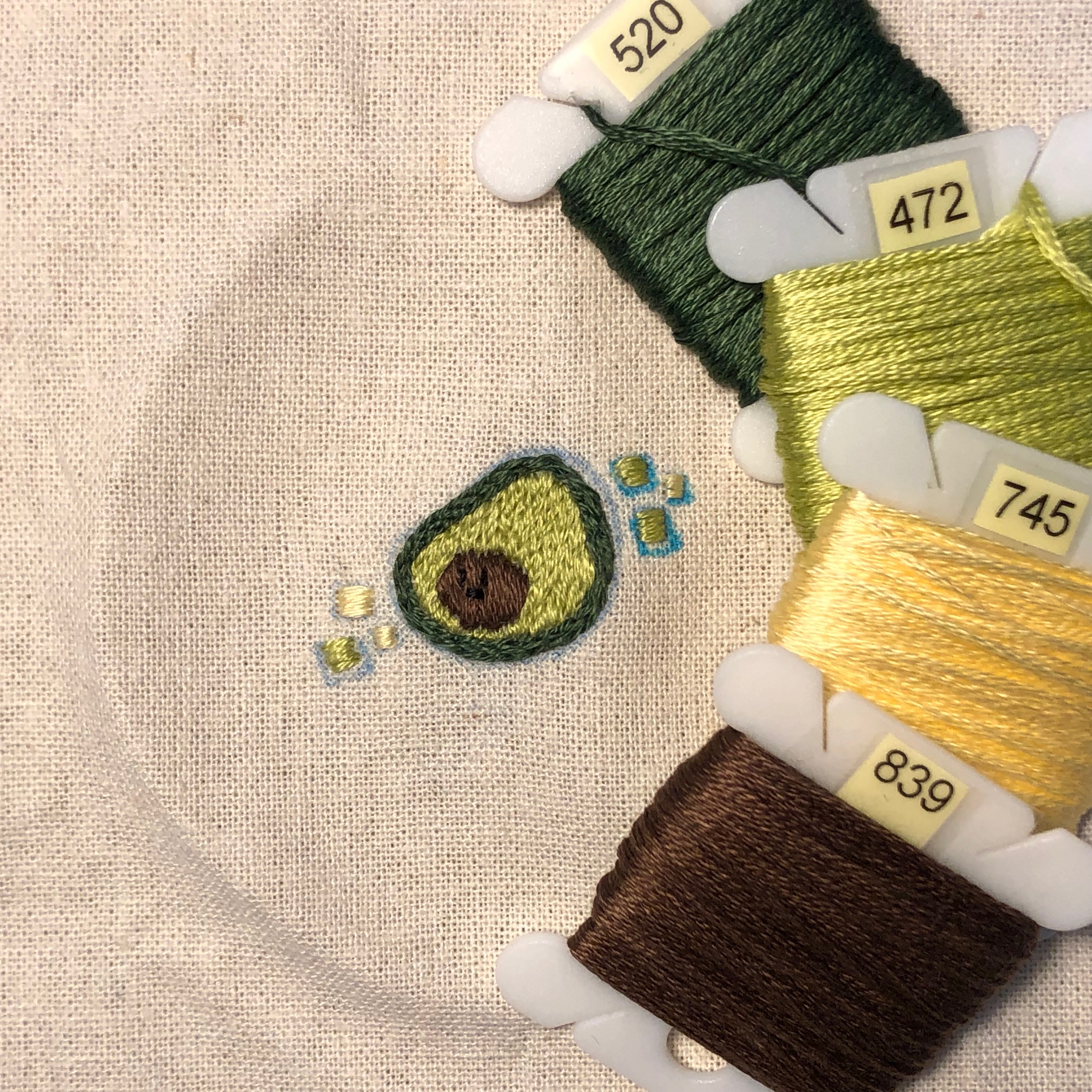 아보카도의 씨앗은 839번 실로, 조각은 472, 745번 실로 새틴 스티치 작업을하였어요. 씨앗 안에 있는 눈과 입은 각각 프렌치넛, 스트레이트 스티치로 마무리 하였습니다. (*스티치 기법은 차차 블로그에 업로드 할 예정이에요.)