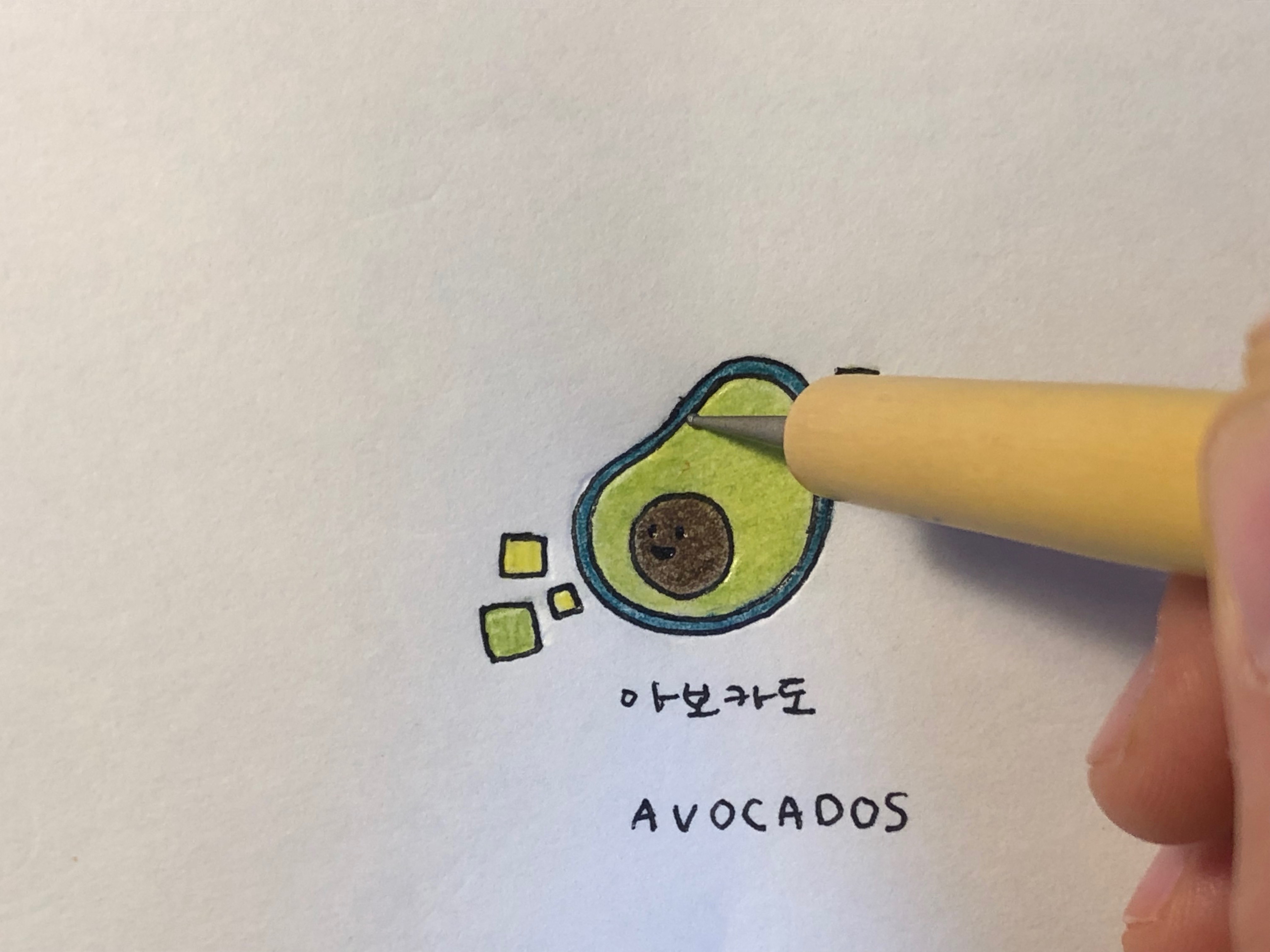 첫 작업물은 아보카도로 해보려고요. 반으로 자른 아보카도, 그 주변에 아보카도 조각(?)들을 조금 그려보았어요. 그림을 그리고 어울리는 색의 색연필로 색칠을 한 뒤에 여러 가지 가지고 있는 자수 실 중 비슷한 색을 찾아 골라내었어요.