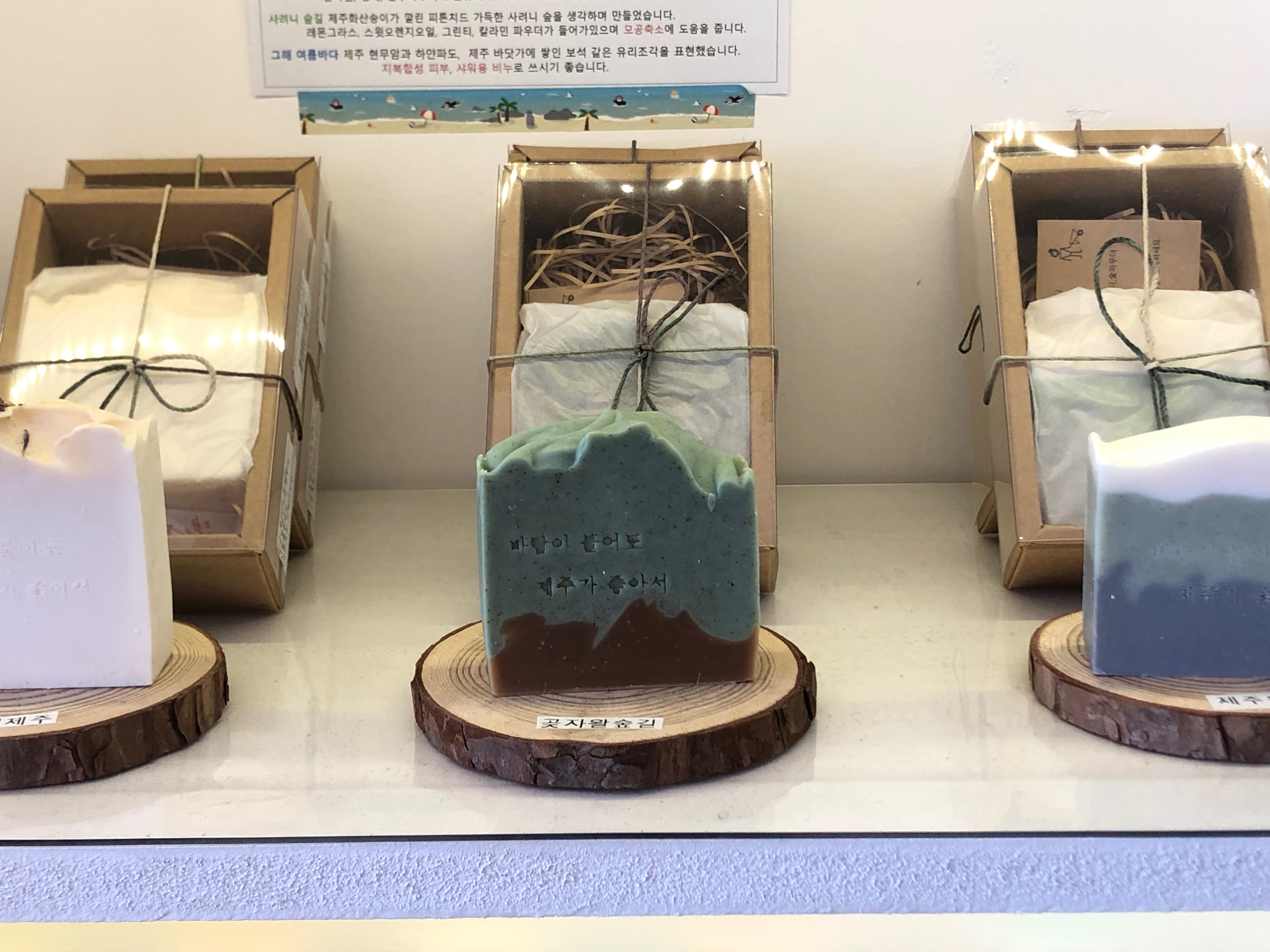 제주 글귀를 담은 여러 가지 수공예 비누도 있었어요. 각 비누마다 어떤 곳을 보고 영감을 받아 만들었는지 장소 이름이 쓰여져 있더라고요. 사용할 때의 비누향은 어떤 향이 나는지 약간 궁금해지기도 하더라고요.