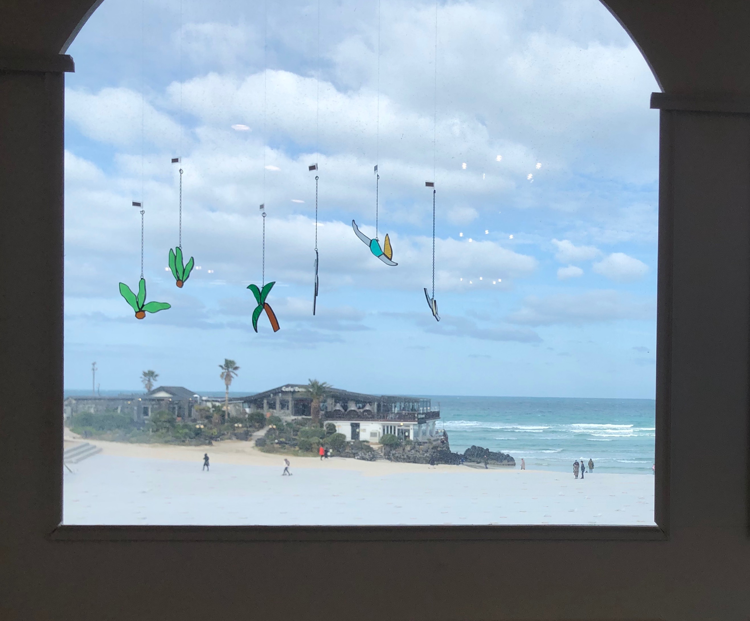 이렇게 바라보는 바다 모습도 너무 좋죠. 함덕 해변이 배경으로 있으니 창에 걸려있는 소품이 별 거 아닌게 아닌 것 처럼 보이는 효과가 있는 것 같아요. 사서 집에 걸어두고 싶은 욕심이 생기더라고요.