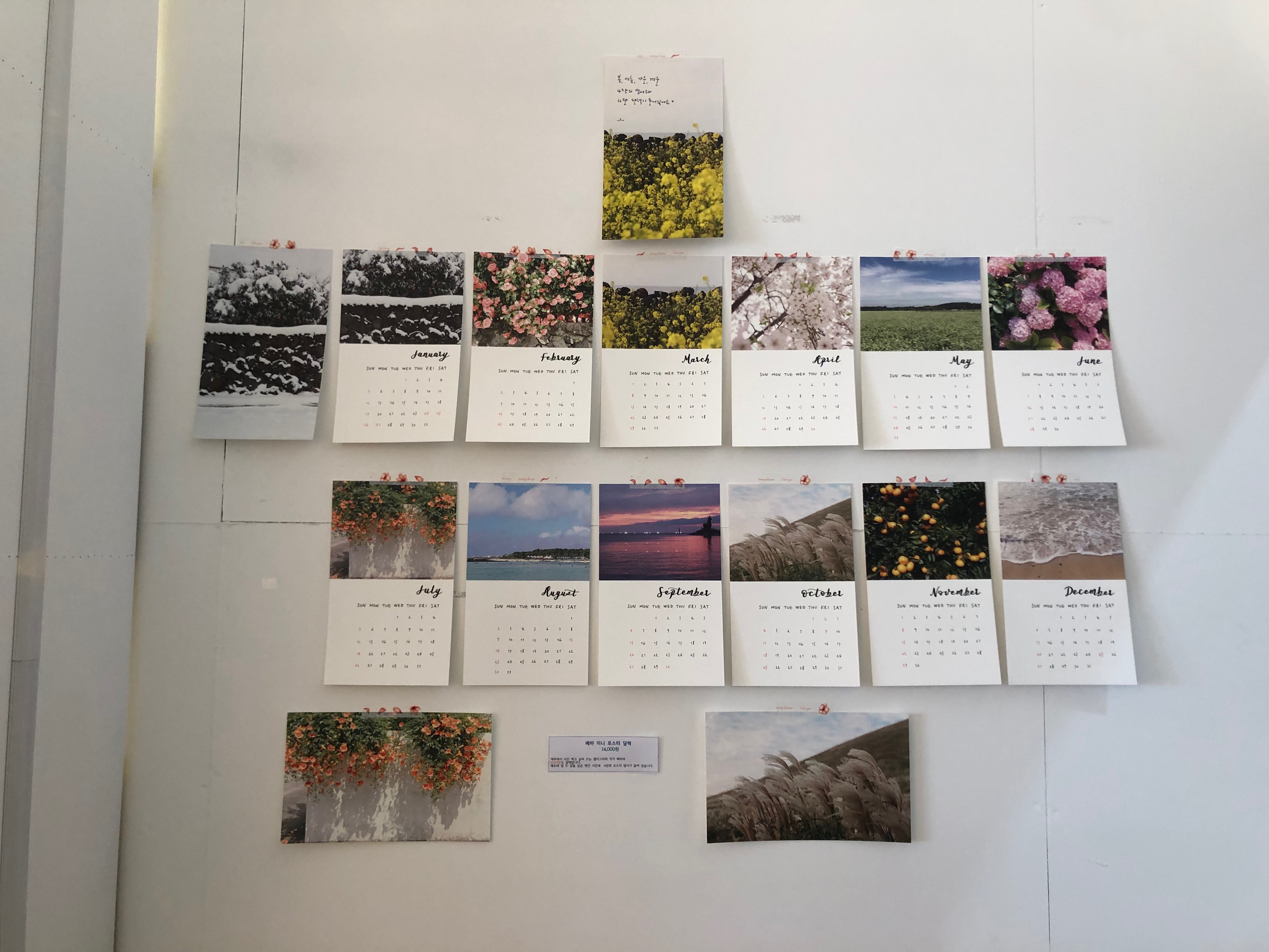 사계절의 제주를 담은 풍경사진을 이용한 미니 달력이 있었어요. 한 달, 한 달 달력을 넘겨보면서 그 달에만 볼 수 있는 제주도의 모습을 볼 수 있다는 것이 매력적인 것 같아요.