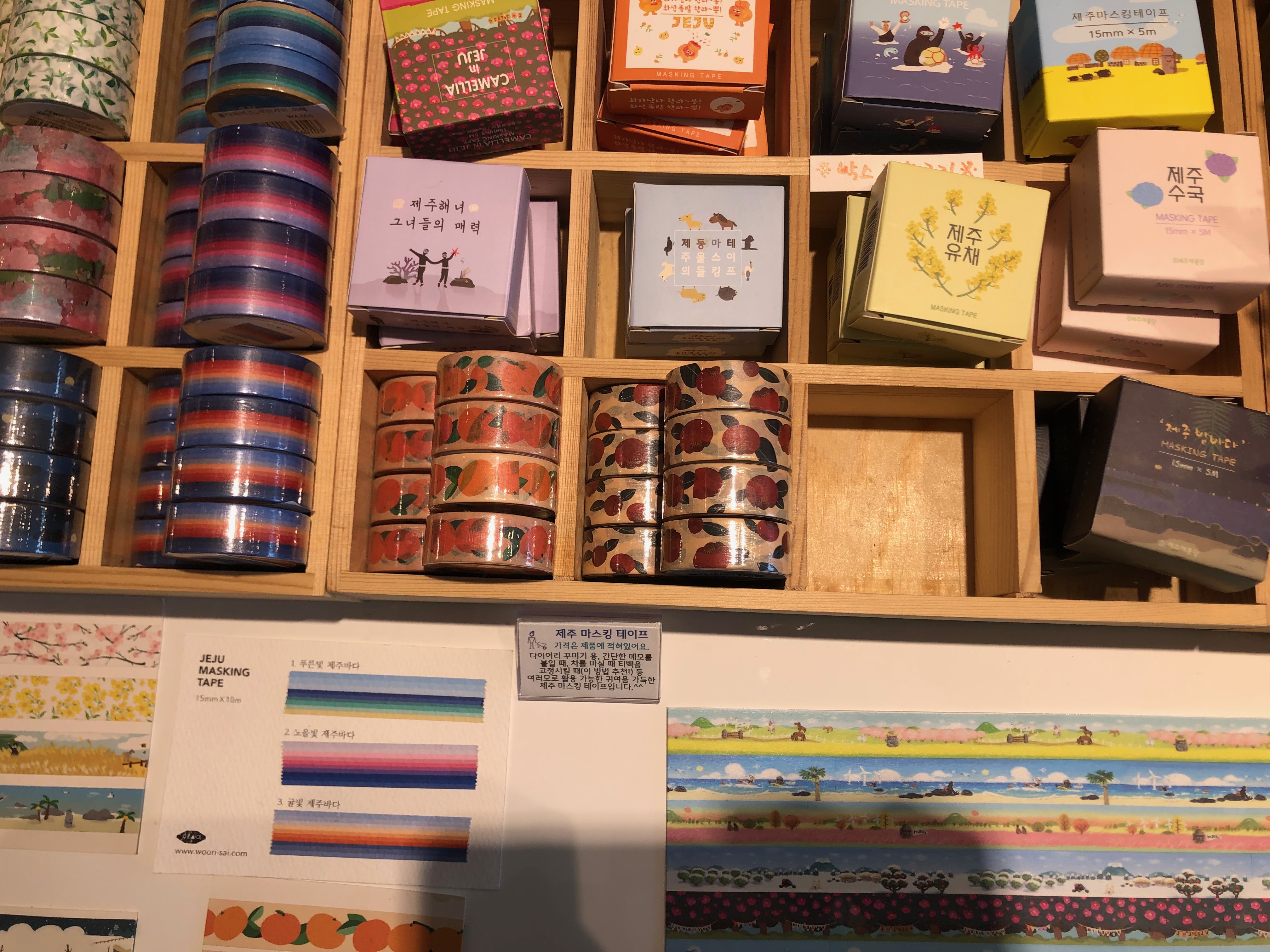 다양한 색과 모양의 마스킹 테이프도 있었어요. 마스킹 테이프는 다이어리를 예쁘게 꾸미거나 평소 포장하는 재료에 관심이 많으신 분들이 많이 사서 모아놓으시던데, 그런 분들이 마음에 드는 것을 사거나 주변에 사서 주면 기뻐할 것 같아요.