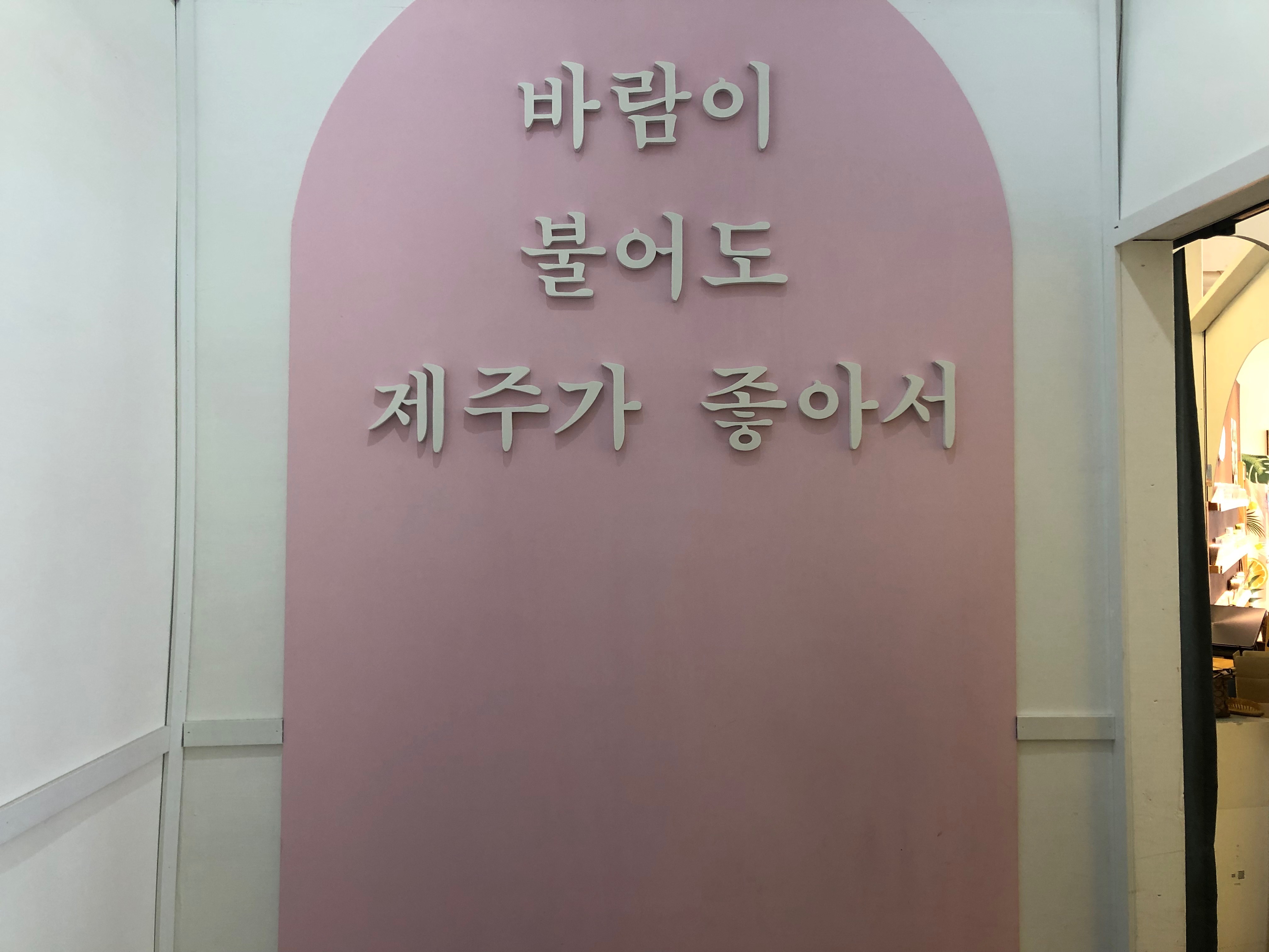 들어가는 입구가 핑크핑크해요. 제주도는 바람, 여자, 돌이 많다고 해서 삼다도라고 불리기도 하죠. 해변에 있을 때 바람이 너무 많이 불어서 예쁜 사진은 찍지 못하겠다며 친구랑 같이 투덜거렸는데, 바람이 많이 불어도 제주는 너무 매력적이니 그래도 제주도가 좋은 건 맞네요.