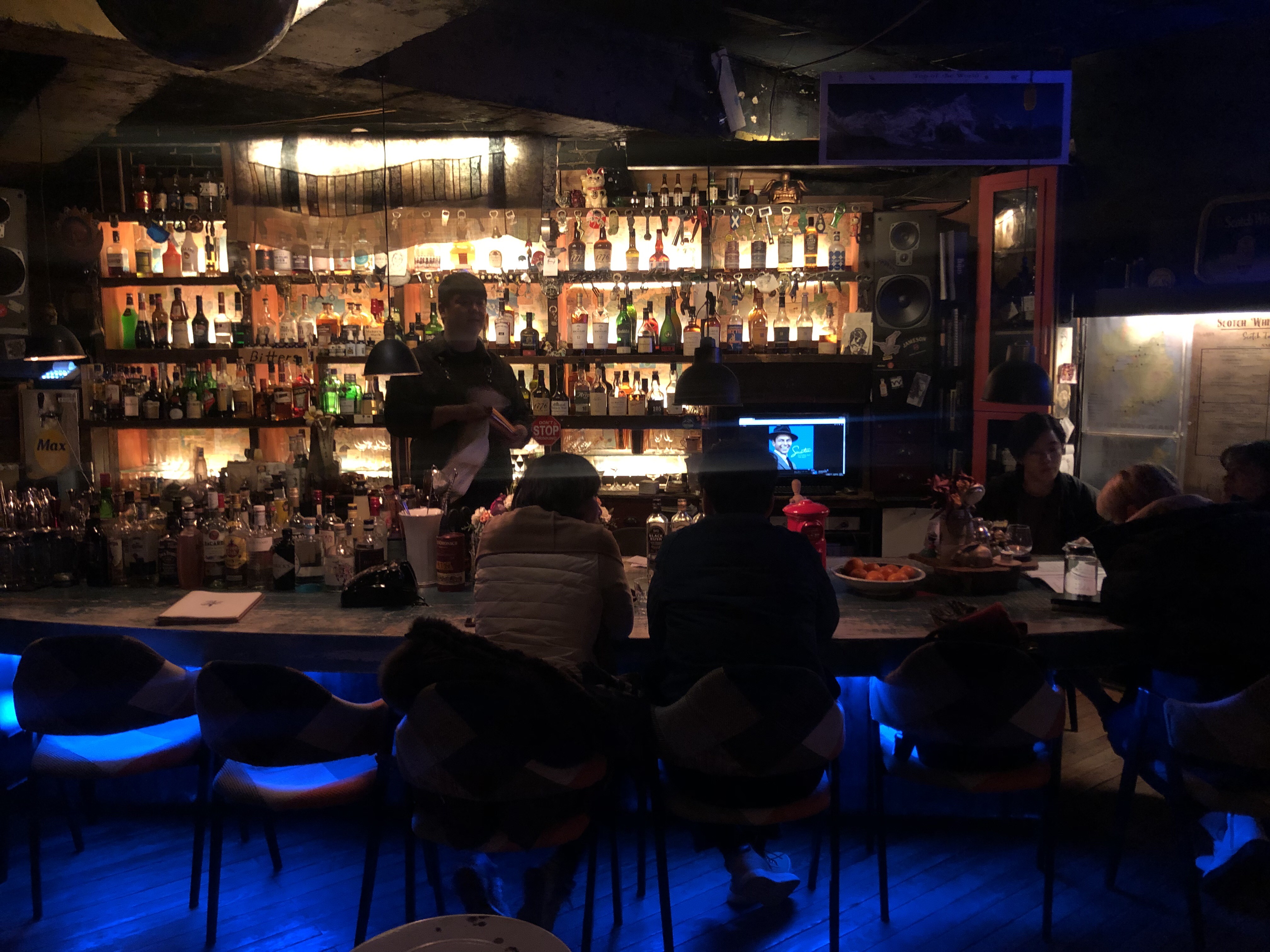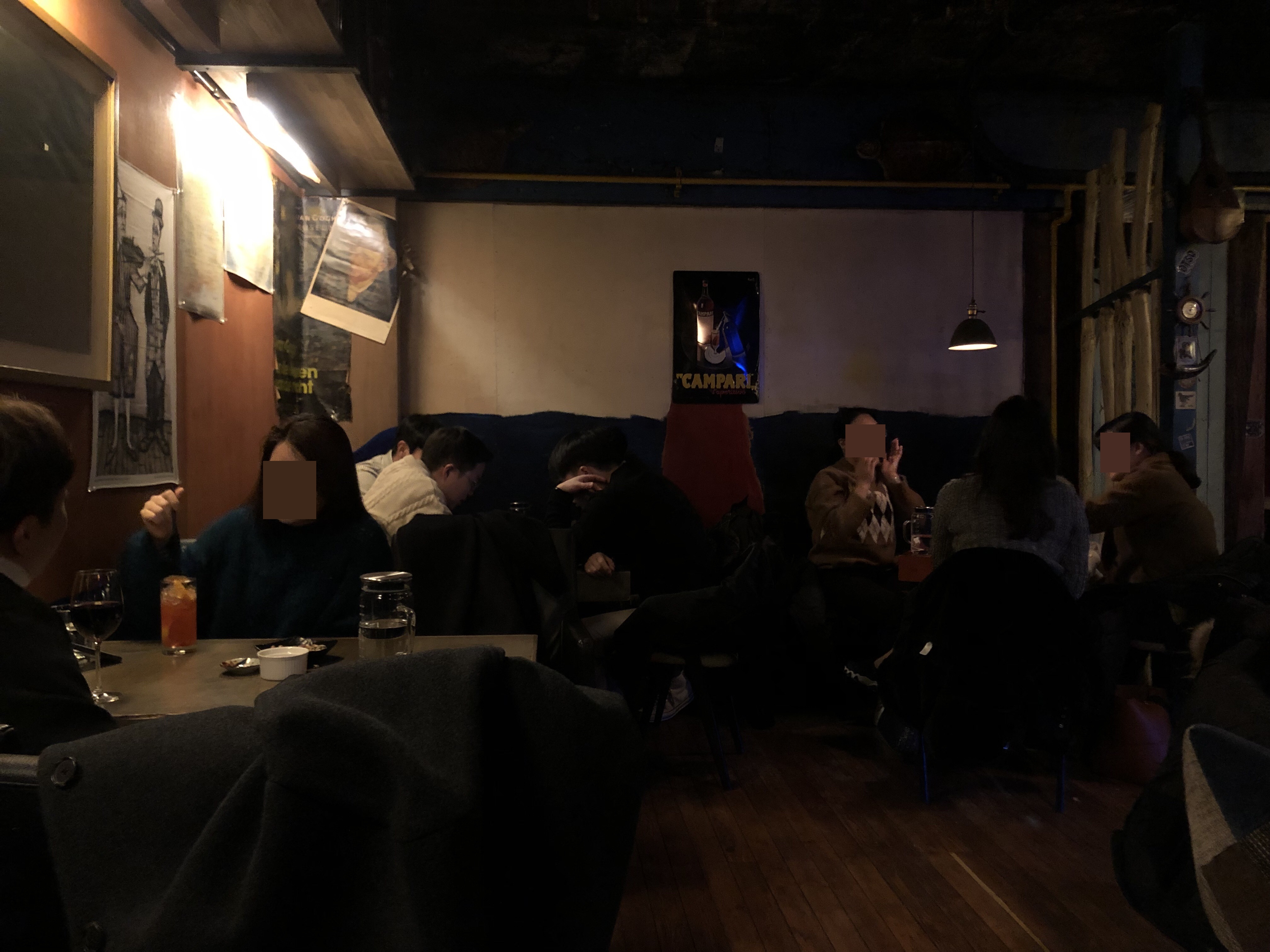 안의 분위기는 외관과는 전혀 다른 모습이었어요. 칵테일 바라는 가게에 걸맞게 어둑어둑한 분위기에 여러 술병들이 조명아래 반짝반짝 빛나고 있었답니다. 자리는 연말이라 그런지 거의 꽉 차있었어요. 저와 친구들은 문 앞쪽에 작은 테이블 한 자리를 무사히 차지하고 앉았었지요.