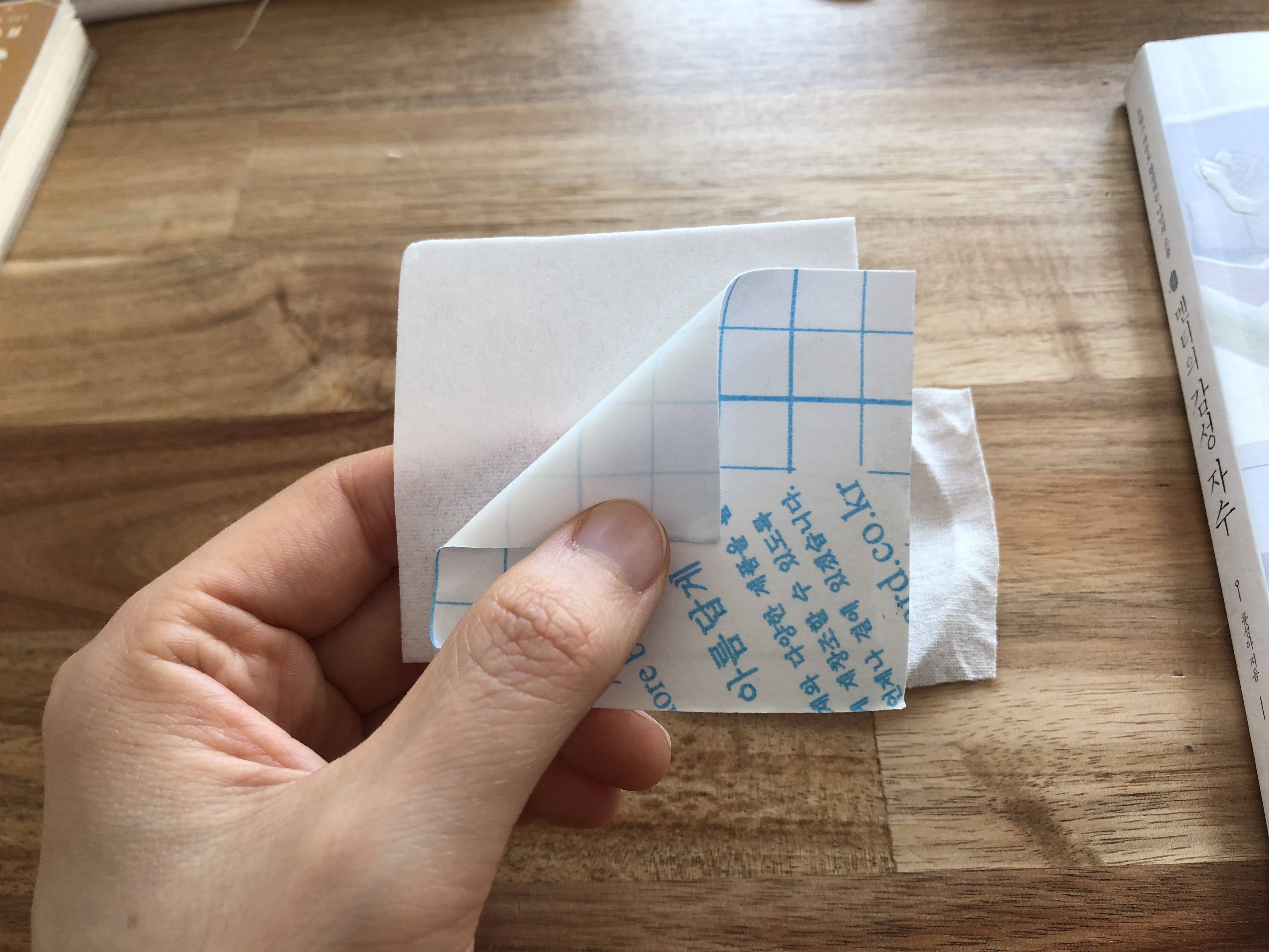 접착펠트지는 뒷면에 스티커와 같이 떼어내는 면이 있어요. 저 부분을 떼어내면 접착력이 있는 면이 드러나게 됩니다.