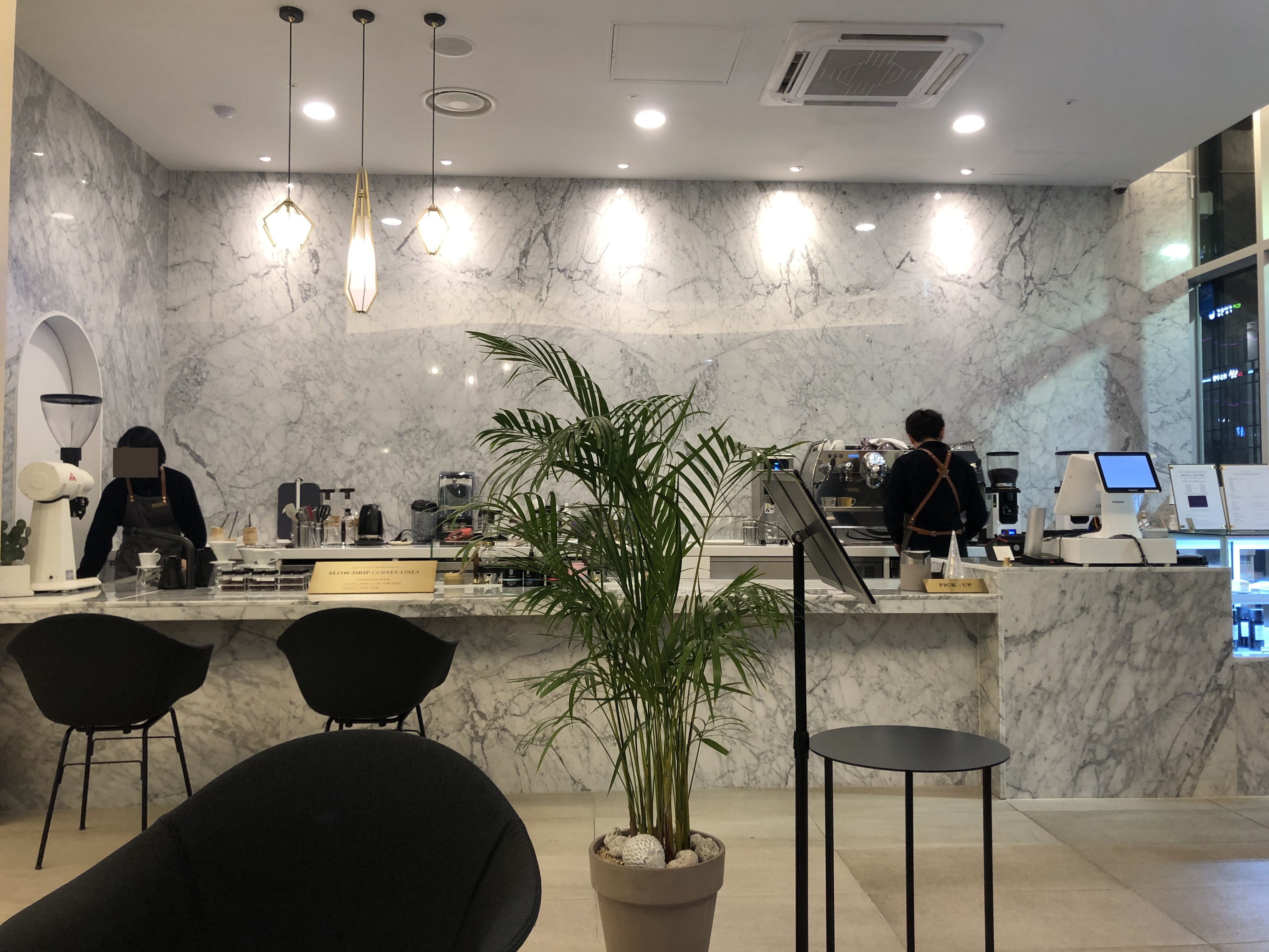 카페 내부는 큰 샹들리에, 대리석, 큰 기둥 등 밖에서 볼 때의 고급스러운 느낌의 연장선으로 인테리어가 돋보였어요. 커피를 만드는 곳도 바리스타 분들을 더욱 빛나게 해주는 듯한 모습이었네요.