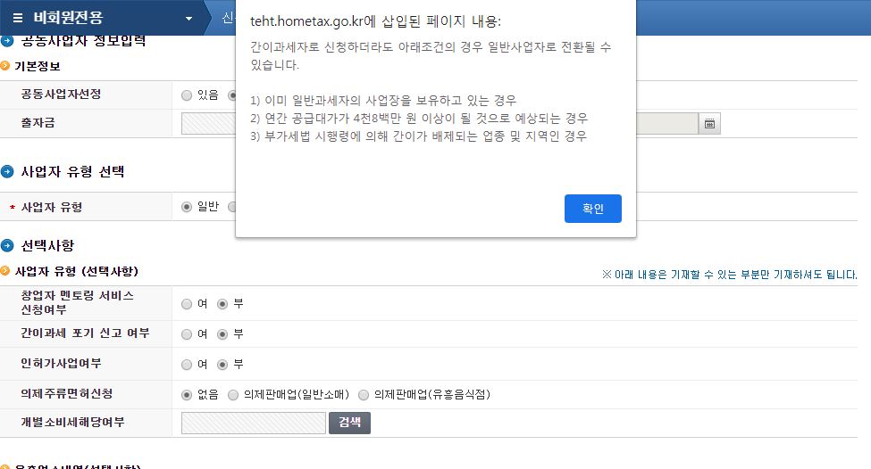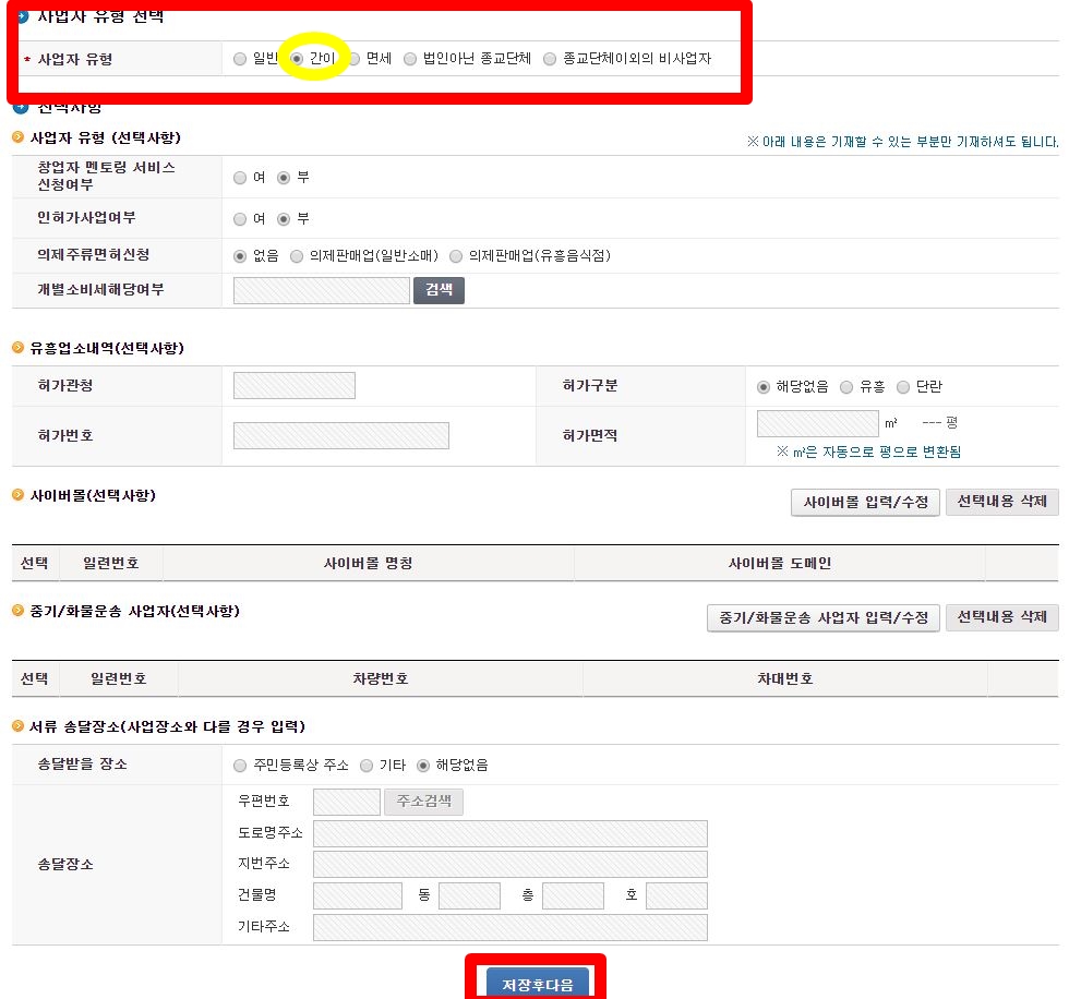 그 다음으로는 사업자 유형을 선택해야하는데요. 저는 여기서 일반이 아닌 '간이'에 체크를 하였어요. 저는 소상공인(*소상공인: 상시 근로자 수가 5인 이하인 사업자. 제조업, 광업, 건설업, 운수업의 경우에는 10인 이하를 이른다.) 이기 때문에 간이과세자가 가능하다고 하더라고요.