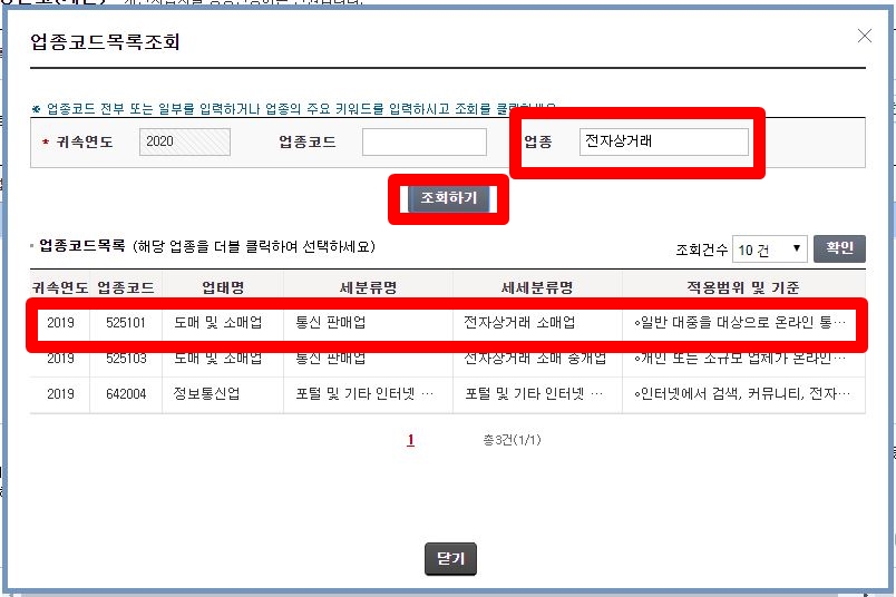 그러면 이와 같이 업종코드를 알아볼 수 있는 업종코드목록조회 화면이 뜨는데요. 여기서 업종 부분에 '전자상거래'라고 입력한 뒤 조회하기를 누르면 전자상거래와 관련된 '업종코드목록'이 나옵니다. 여기서 업종코드 52510 전자상거래 소매업을 더블 클릭해서 선택하면 업종 선택이 완료됩니다.