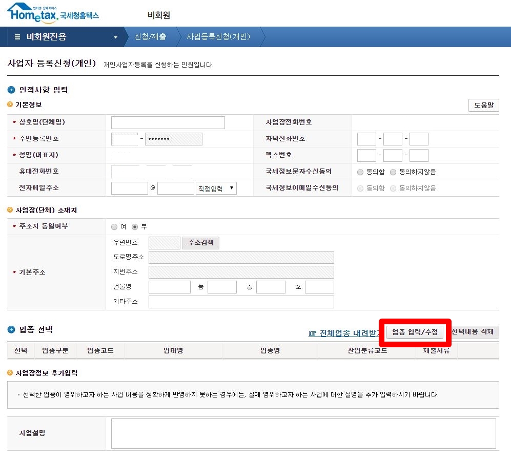 업종선택을 할 때에는 위와 같이 '업종 입력/ 수정'을 클릭합니다. (업종선택 옆에 '전체업종 내려받기'에서 받은 한글문서에서 자신에게 적합한 업종코드를 찾을 수 있습니다.)