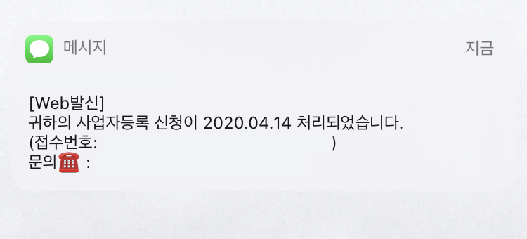 시간이 조금 지나니 접수가 되었다고 문자로도 내용이 오더라고요. 이 절차가 복잡한 것도 아니고 특별한 것도 아니지만 뭔가 사업자로 일하게 된다는 기대감이 샘솟는것 같아요. 온라인으로 신청하면 하루정도의 시간이 소요된다고 해요. 사업자등록증이 나오면 이후에는 사업자통장을 개설하려 해요. 부지런히 하나씩 해나가보아야겠습니다.