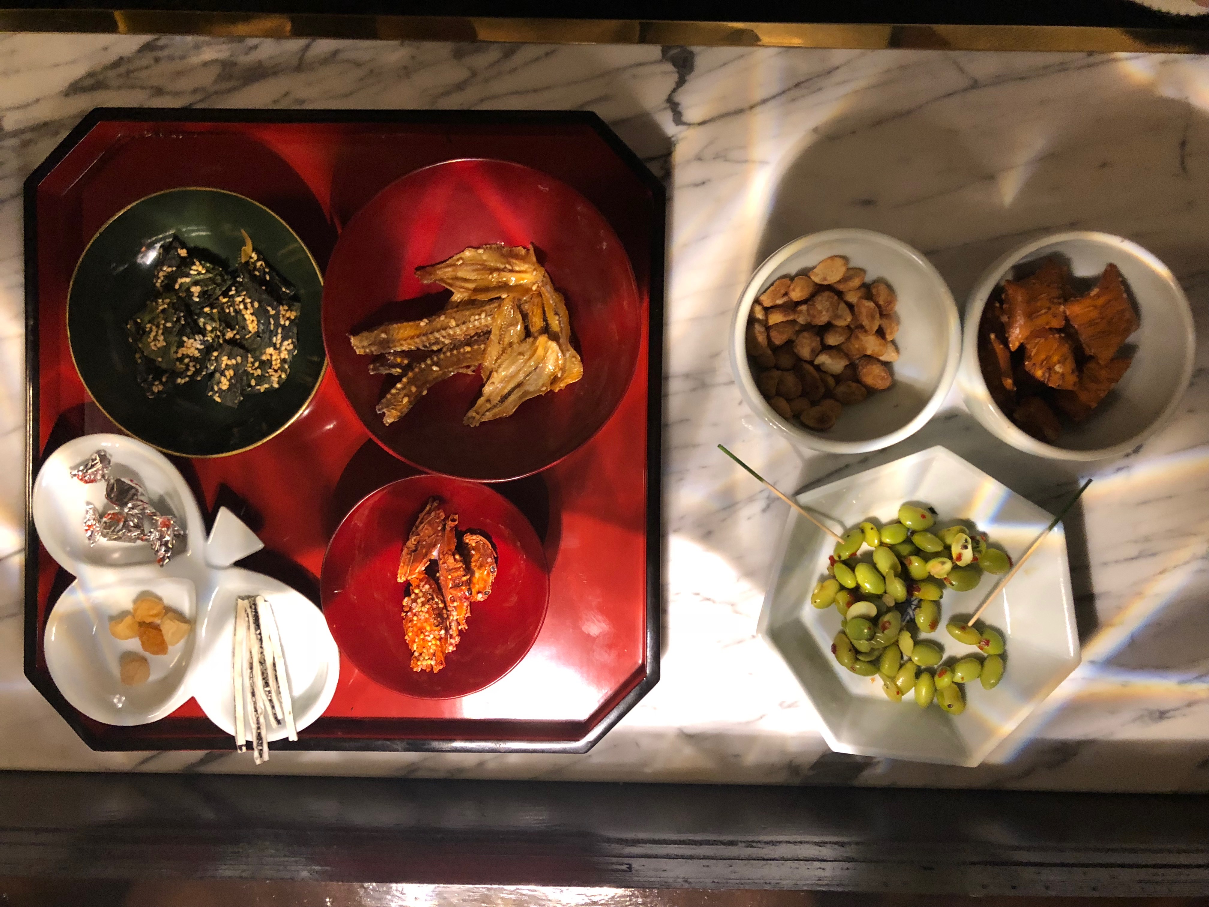 그리고 일본에서 직접 사 오신 안주들이라고 하시며 사장님께서 몇 개를 더 꺼내 주셨습니다. 해산물 종류였는데 모두 맛이 매우 짭짤했어요. 그래서 하나를 먹더라도 조금씩 잘라서 먹게 되더라고요. 깔끔한 술과는 잘 어울리는 안주들이었습니다.