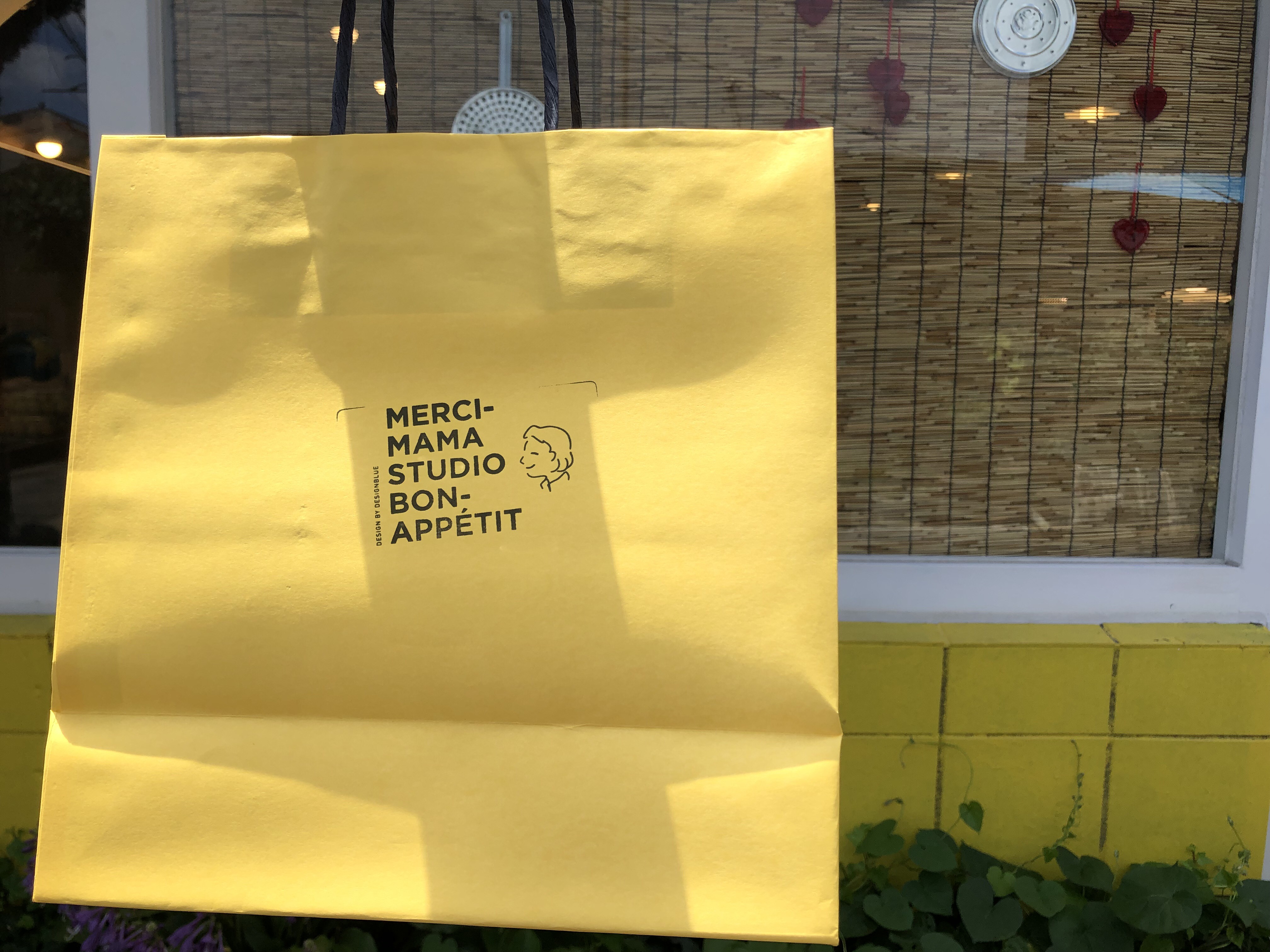 사고 바로 먹을 건 아니어서 봉투에 담아달라고 말씀드렸는데, 이렇게 예쁜 종이봉투에 담아 주시더라고요. 봉투도 노란색으로 메르시마마의 상징적인 색깔을 잘 드러내 주는 것 같아요.