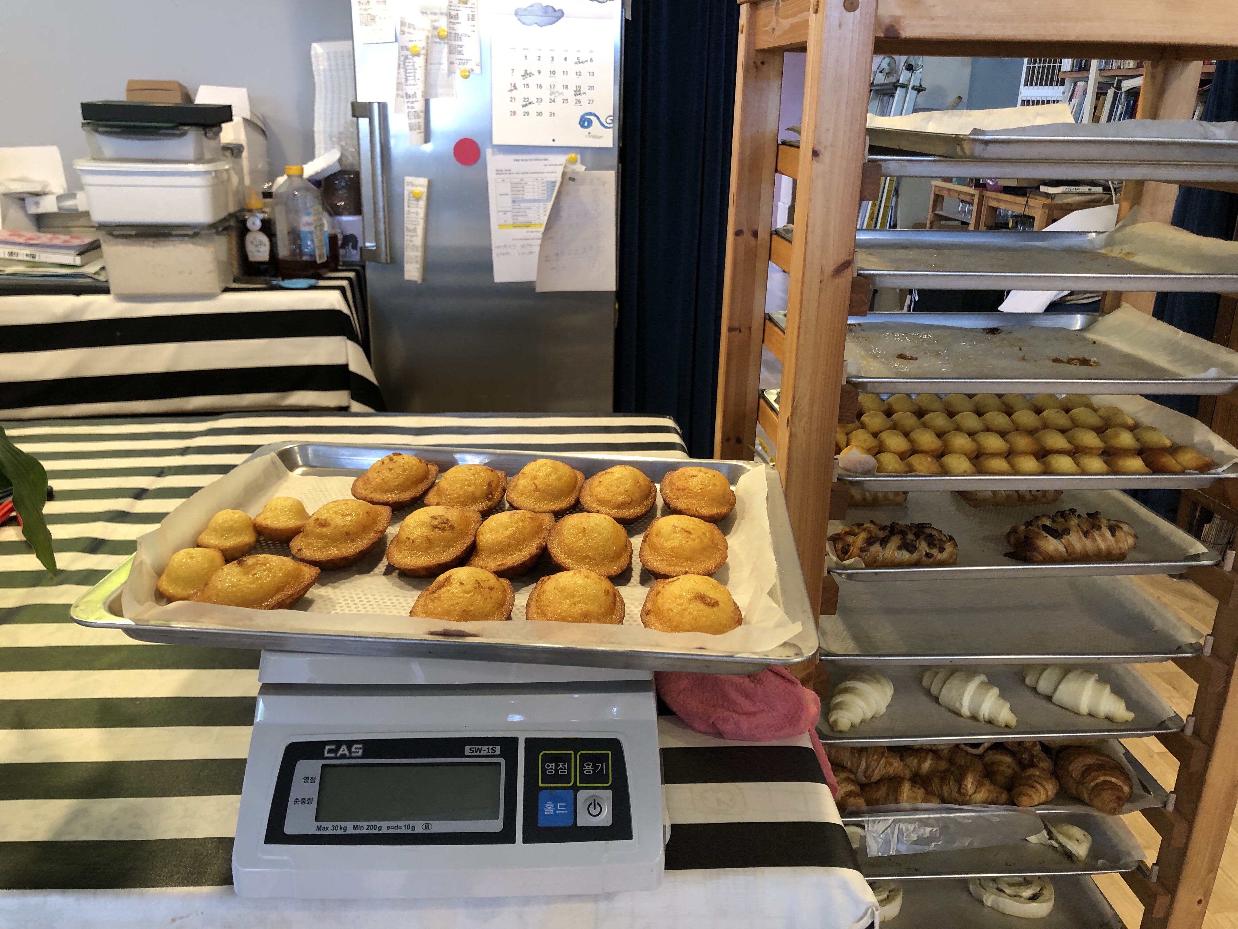 계산대 앞에 이렇게 마들렌이 놓여있었는데, 안 사 먹을 수 없겠더라고요. 마들렌 옆에도 진열되지 않은 빵, 구워야 하는 빵들이 놓여있었어요. 아직 진열하지 않은 상태라서 더 많은 빵을 구경하지 못했습니다. 혹시 방문할 예정이 있으신 분들은 11시 너무 근접해서 가시기보다는 조금 지난 뒤에 가는 것도 나쁘지 않을 것 같아요.