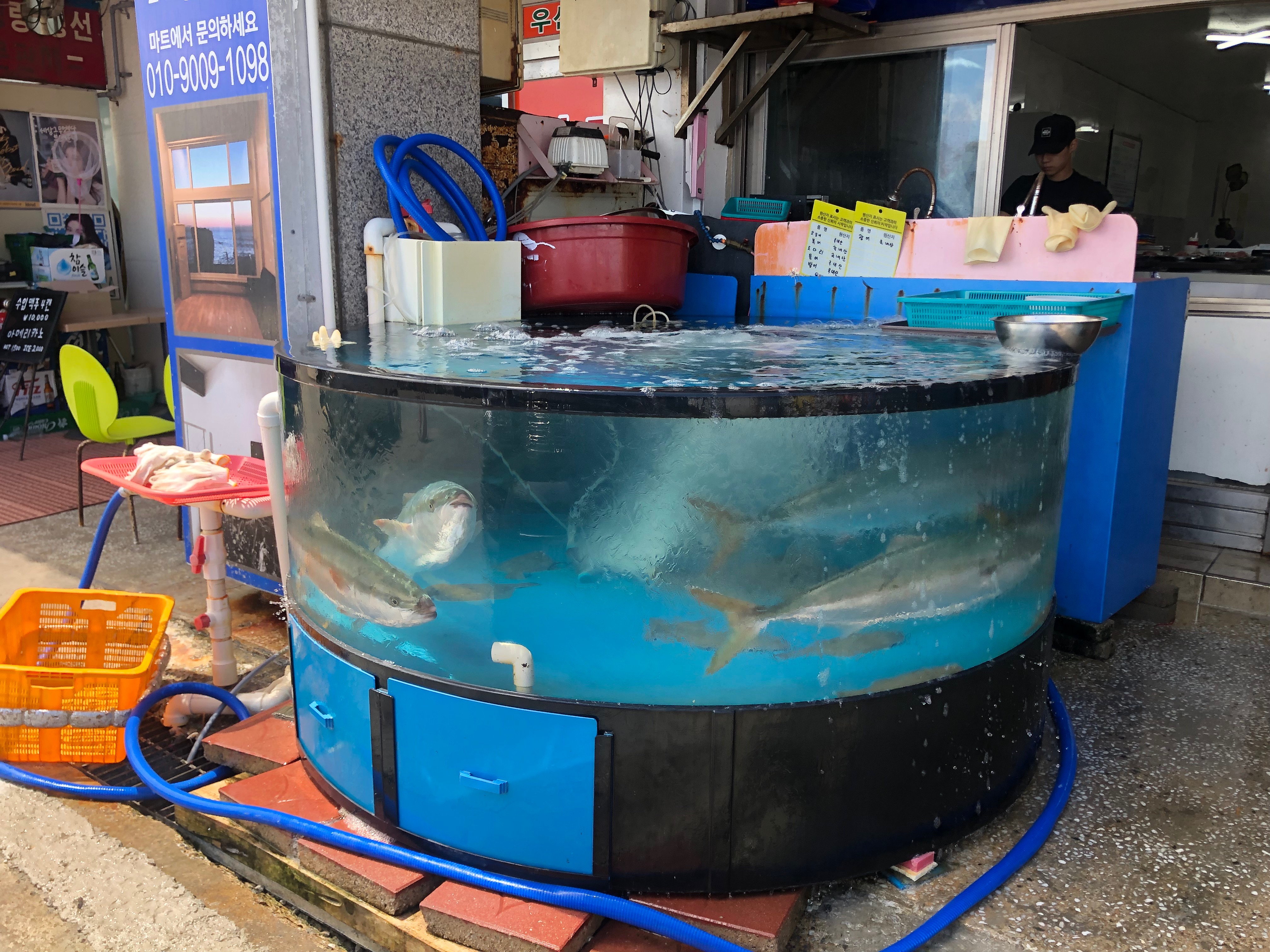 가게 앞에는 수족관이 하나 있었는데 엄청나게 큰 물고기가 헤엄을 치고 있었어요. 수족관 뒤 원산지 표시하는 곳에 오징어, 복어, 토다리, 문어, 방어, 광어라고 써 있었는데, 이런 종류의 어류들이 수족관 안에 있는 거겠죠? 사진으로 보이는 물고기는 방어 같습니다.