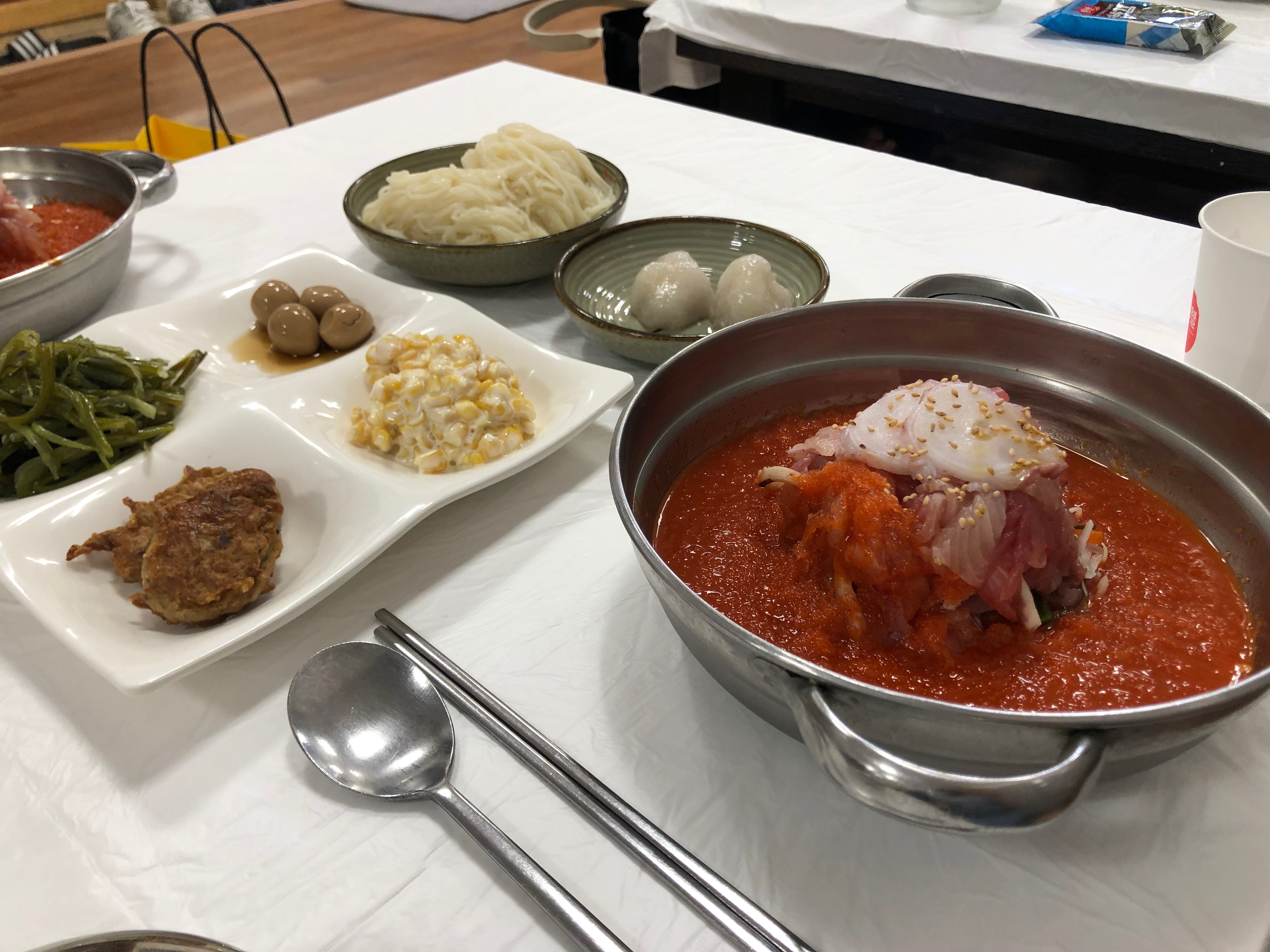 밑반찬으로 동그랑땡, 옥수수콘, 메추리알장조림, 미역줄기 무침이 기본적으로 제공됩니다. 그리고, 강원도 특산물인 감자떡을 인당 한 개씩 주세요. 감자떡은 리필은 안 되는 것 같더라고요. 그리고 물회에 넣어 비벼먹을 소면과 밥 한 공기가 함께 나옵니다. 그 외에도 김을 한 개 주시더군요. 물회 비빈 것에 김을 얹어 먹으면 정말 맛있더라고요.